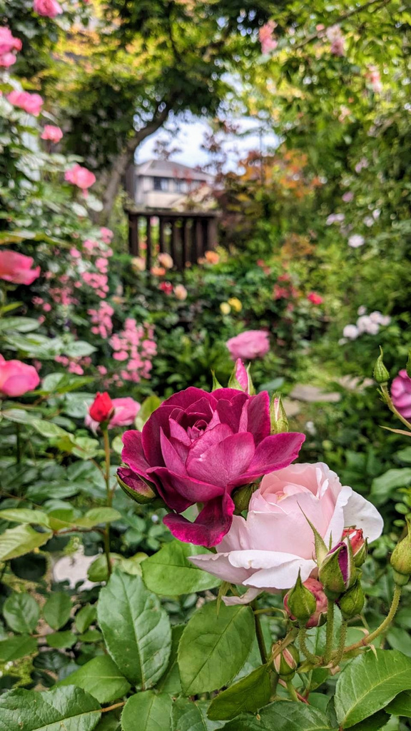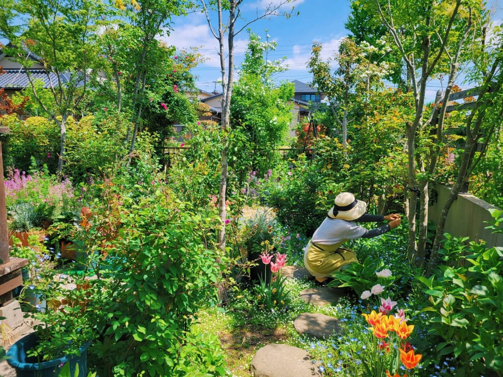 庭は年月とともに変化していきます、冬はクリスマスローズ、早春はリナリアやムスカリ、チューリップ、5月はバラや宿根草などひと月ごとに景色が変わります。小屋の窓辺につるバラが降りてくるまで数年かかるでしょう